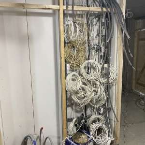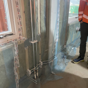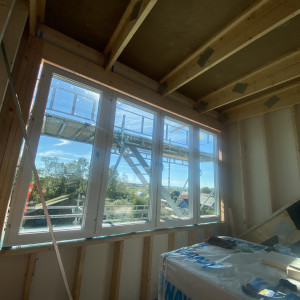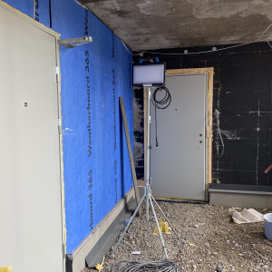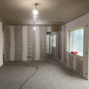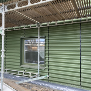 Nu är husets ytterväggar på plats och de gröna fasadskivorna monteras för fullt. Hus A är tätt och provtryckt med godkänt resultat. Arbete med innerväggar och installationer pågår för fullt. I hus A har flytspackling genomförts och målaren har påbörjat spackling av väggar och tak.