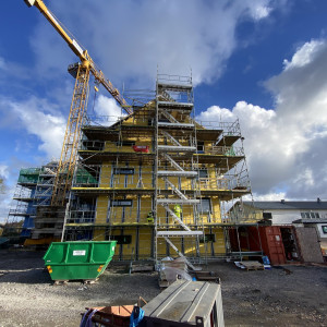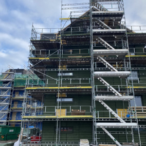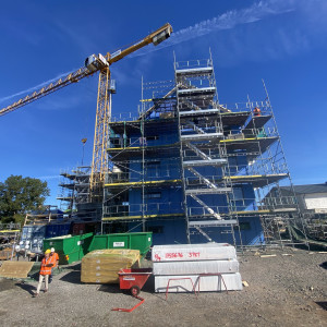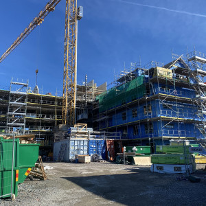 Husen fortsätter växa. Hus A är nu uppe i sin fulla höjd, och takstolar monteras. Arbeten med utfacknaingsväggar (ytterväggar) pågår också.